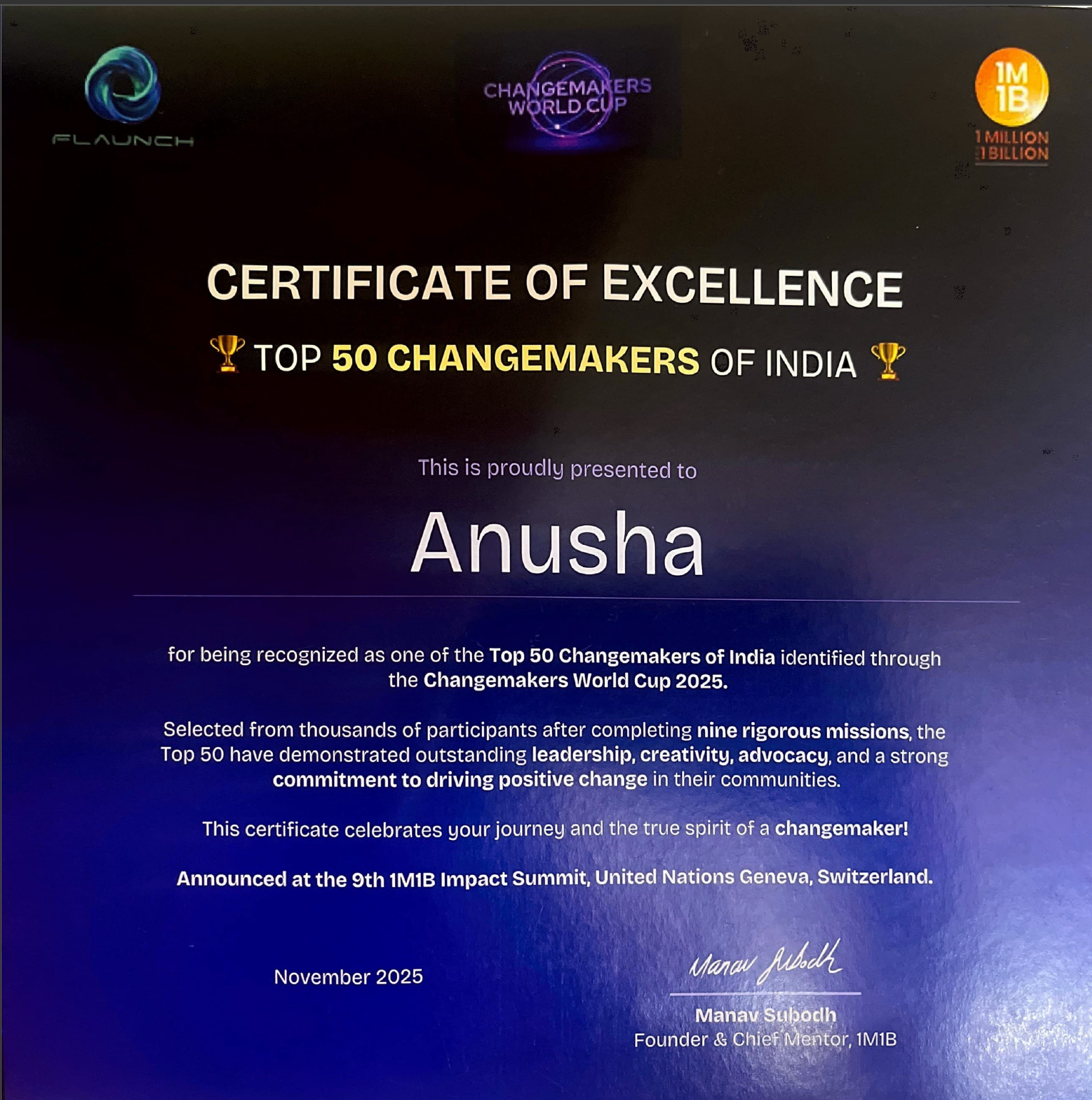 Recognized as one of the World's Top 50 Changemakers at the 9th 1M1B Impact Summit at the United Nations Headquarters, Geneva, Switzerland.