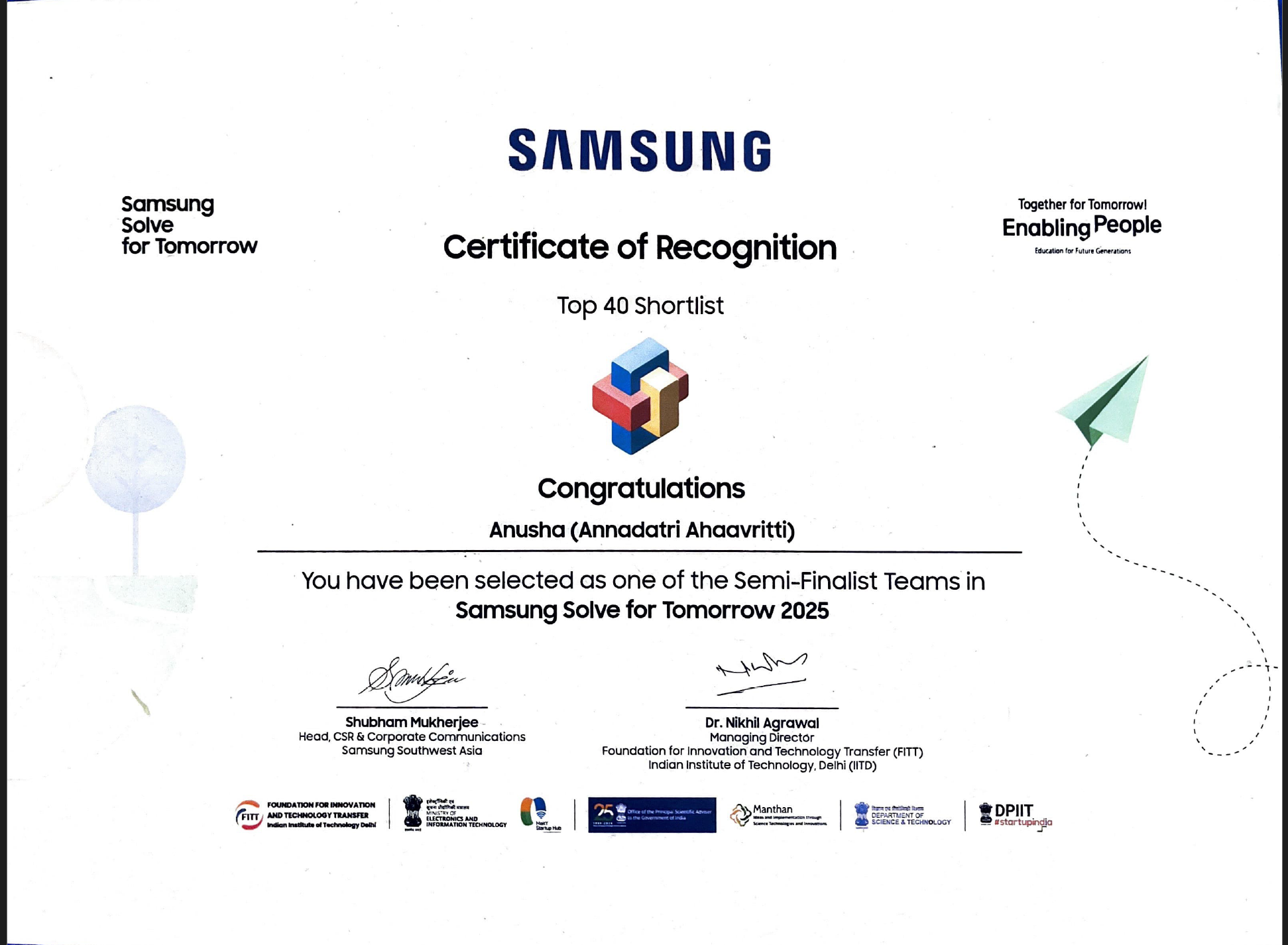 Visit AnnadatriBuilt a web app connecting food donors directly with NGOs in real-time. Recognized in the Top 40 of Samsung Solve for Tomorrow at IIT Delhi.